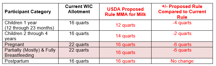 IDFA estimates that the USDA’s proposal for the updated WIC food package would reduce the amount of dairy up to six quarts per month for pregnant participants and others, including: