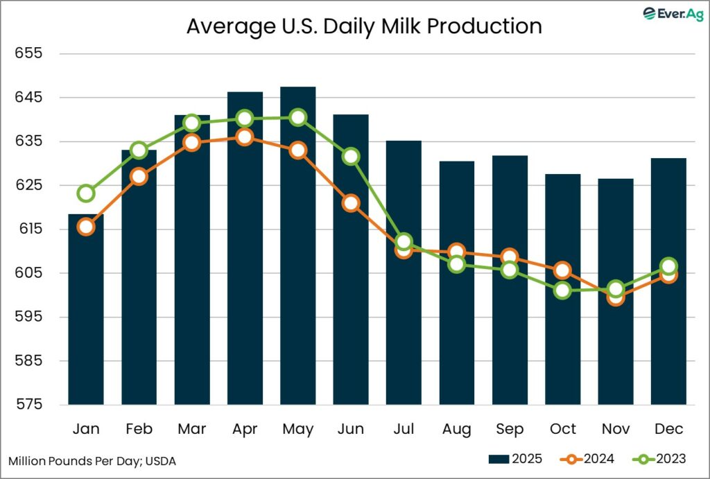 - In all, 2025 milk output totaled 231 billion pounds, a new annual record. Big gains in California helped lead the way as production in the Golden State recovered following 2024’s avian influenza outbreak. There was also a lot of growth in places like Kansas, South Dakota and Texas, where new processing facilities have been built.