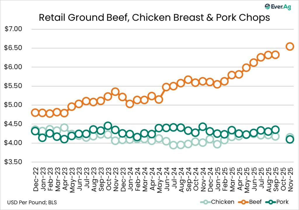 - Meanwhile, prices for chicken and pork sit more than $2.00 per pound below beef. But while volume sales were also up 4.5% for chicken and +0.7% for pork in November, people are not making the major shift to other meats that we may expect when beef prices are this much higher.