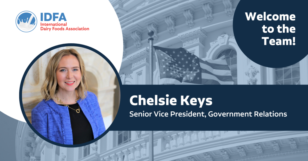 WASHINGTON, Dec. 1, 2025— The International Dairy Foods Association (IDFA) announced today that Chelsie Keys has been named senior vice president, government relations, succeeding a position held by Dave Carlin who announced his retirement from IDFA earlier this year. Keys comes to IDFA from the U.S. Senate Committee on Agriculture, Nutrition and Forestry, where she served as policy director for Chairman John Boozman of Arkansas. Keys has been with the Senate Agriculture Committee for a decade.