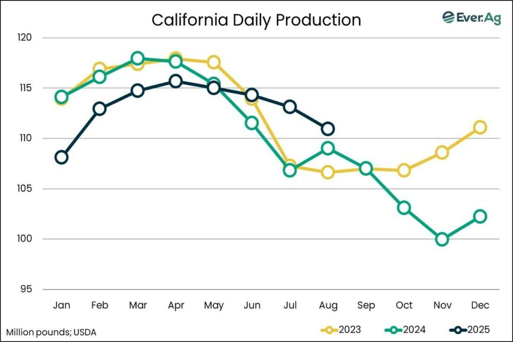 - August output was up another 1.7% versus strong performance in August 2024. Herds in California took a production hit a few months later because of highly pathogenic avian influenza. So, the current milk production growth is not just a rebound from disease impacts.
