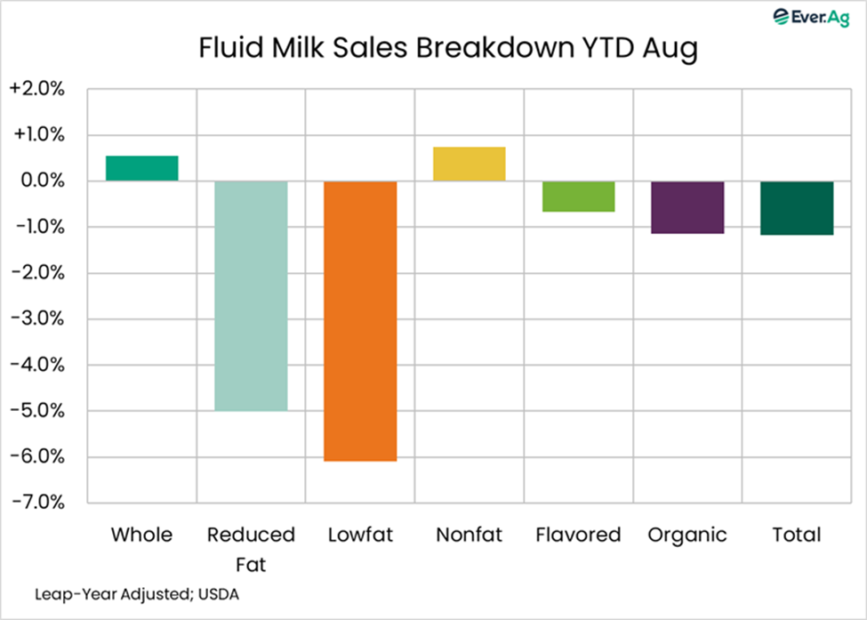 - In August, total fluid milk sales volume (conventional plus organic) fell 4.1% from last year to 3.44 billion pounds, the largest year-over-year pullback in 18 months, although whole milk and nonfat milk sales were up slightly. Year-to-date, sales are down 1.2%, compared with a 0.9% increase a year earlier. That is about 327 million pounds less of fluid milk sales each week.
