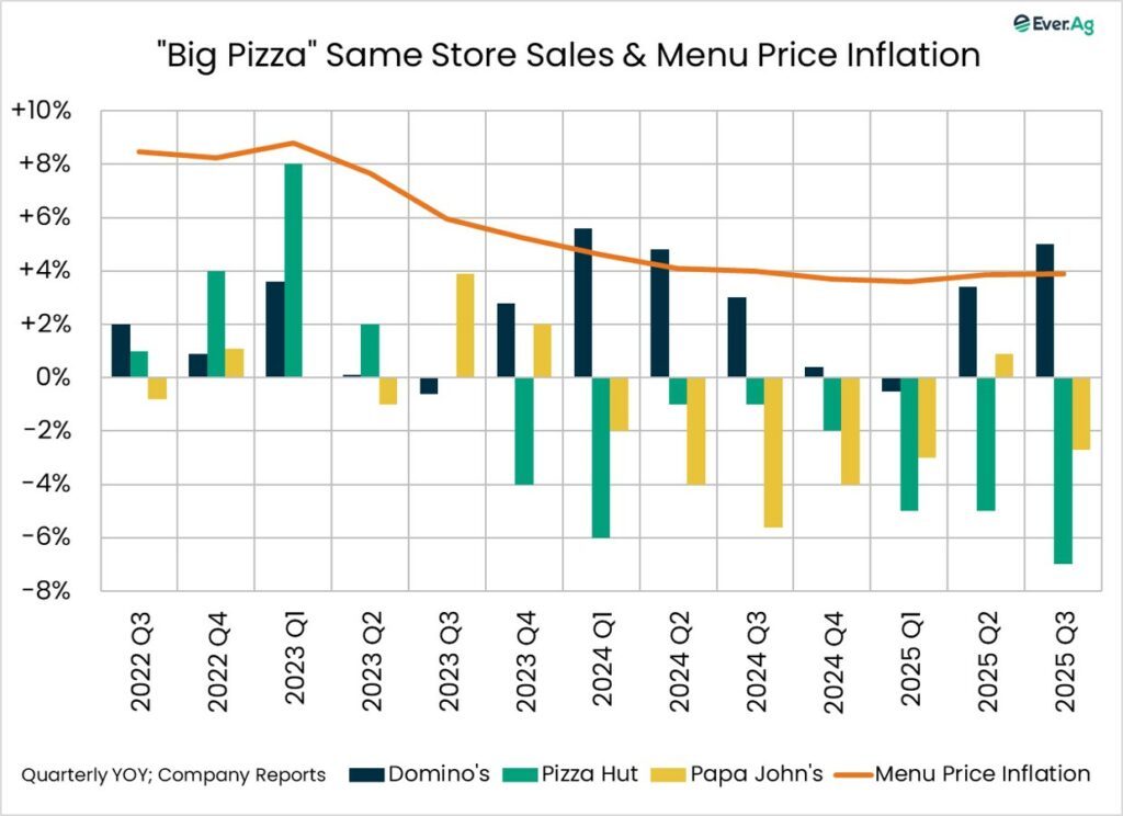 - Most major pizza chains are feeling this impact. The outlier was Domino’s, with Q3 performance the best it has been since Q1 2024 on the back of a new stuffed crust offering and a “$9.99 any pizza, any topping” deal. But at the same time, Pizza Hut and Papa John’s saw slumping sales, and Papa John’s executives said customers were trading down from large to medium pizzas and adding fewer toppings.