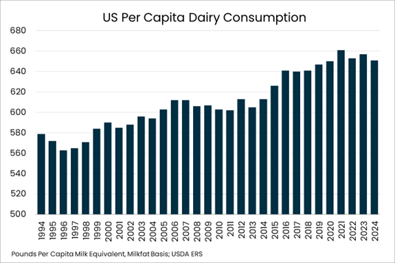 USDA’s Economic Research Service reports that Americans consumed 651 pounds of dairy per person in 2024 on a milk-equivalent, milk-fat basis, a level that nears historic records dating back to 1975 when USDA began tracking dairy consumption trends.