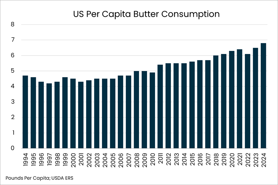 - Butter consumption surpassed all previous records, reaching an all-time high of 6.8 pounds.