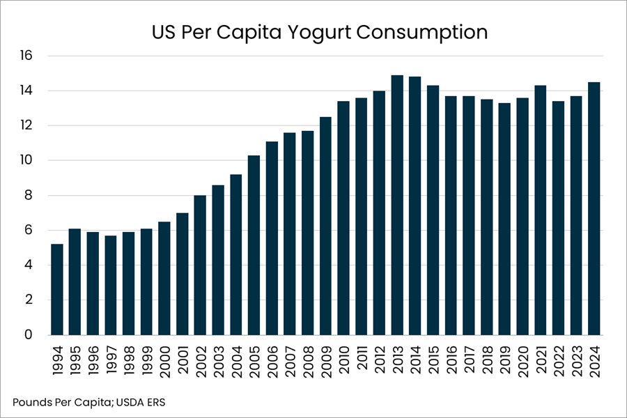 - Yogurt consumption continued its impressive growth, increasing to 14.5 pounds in 2024, a 6% increase from 2023.