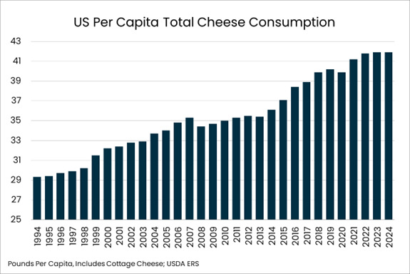 - Total cheese consumption was unchanged at 41.9 pounds per person.