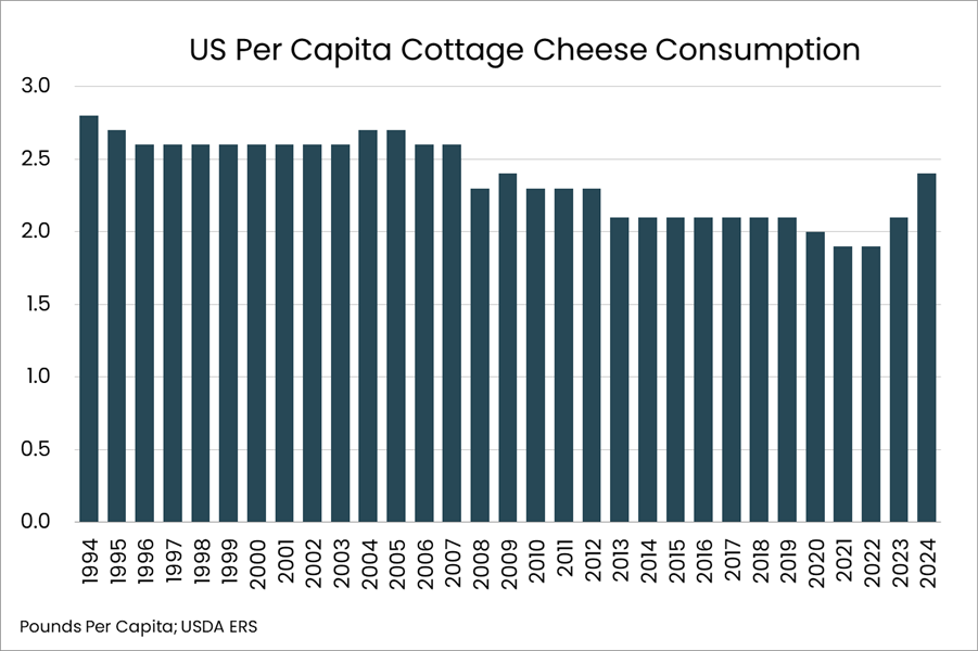 - Consumption of cottage cheese rose to 2.4 pounds, the highest level since 2009.
