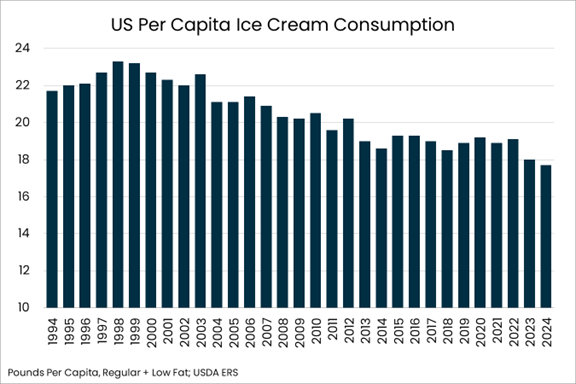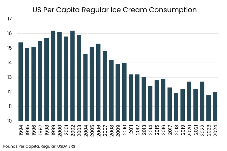 - Regular ice cream consumption also grew in 2024, reaching 12 pounds per person.
